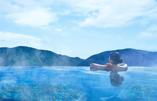 本期推荐酒店-天悠,地处高台,眼前无任何遮挡,将箱根外轮山的绝佳景色尽收眼底。温泉泡池层层相连,宛如水面融入了天空,感觉就好像在空中漂浮一般。